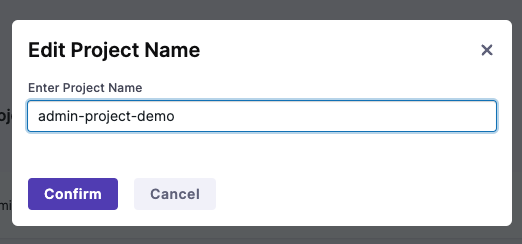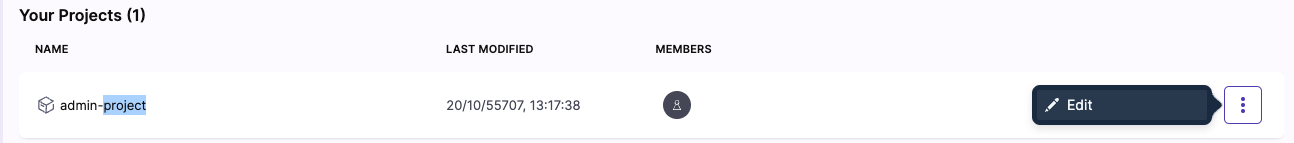 Click options icon to open the options menu and click on the edit option (demonstrated in this example as admin-project) to enter the edit mode: